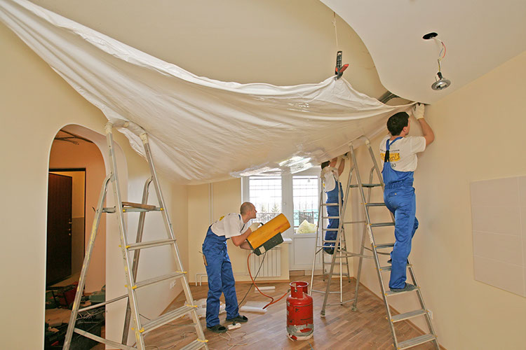 Специальной газовой горелкой полотно разогревают для достижения эластичности. Можно сказать, что половина установки натяжного потолка уже сделана. После нагревания полотно натяжного потолка способно растягиваться и монтажники заправляют его в профиль по всему периметру.